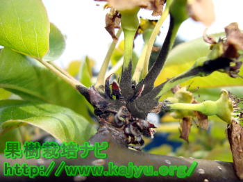 果実に付く黒星病 他の果実に感染しないように早期に切り落とすことが必要です。 |