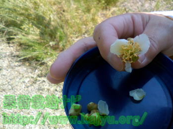 雄花の採取 蕾が膨らみだ雄花を採取します。 プラムの場合には大石など。 |