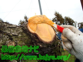 胴枯病に強い品種(豊水等)では、感染し難く、また感染しても侵食が遅いのでので感染箇所を切り落とす等の後の処置を行えます。このため、作業軽減の観点から幹や主枝、亜主枝の傷口に使用し、枝の先端部などの小さな傷口は気付いた範囲で使用します。(無理に使用する程の必要はない。)