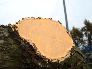 大きな切断面は成長を終えた木質部が露出することで雨水が内部に浸透して内部を腐食させることで空洞化の原因となるため、殺菌癒合剤・癒合促進剤で切断面を保護します。